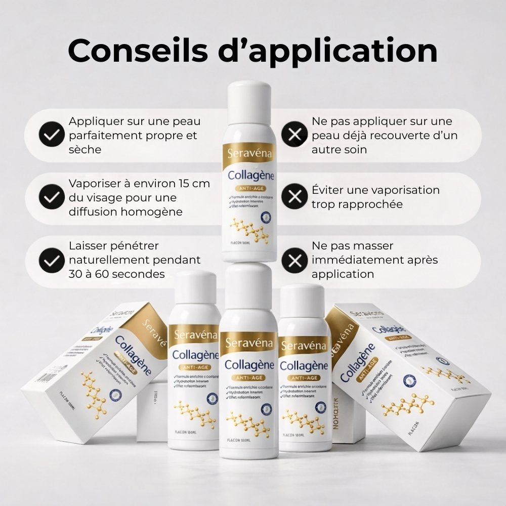 Oui ! Commencez par le spray raffermissant au collagène Seravéna sur peau propre et sèche. Laissez-le absorber pendant 30 à 60 secondes, puis appliquez votre soin hydratant ou sérum préféré. Terminez avec de la crème solaire le matin pour une protection complète et des résultats fermes toute la journée.
