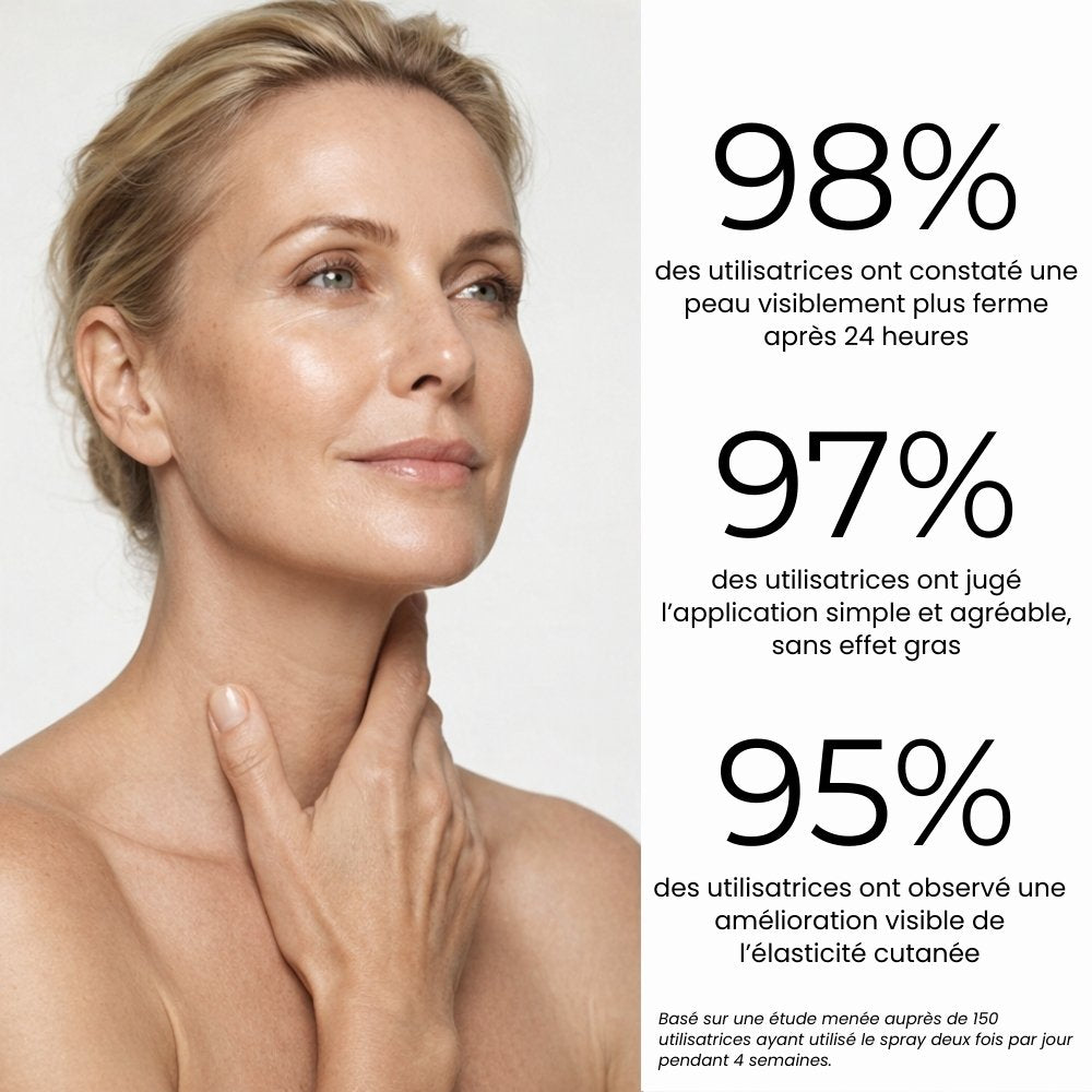 Le spray s’utilise sur le visage, le cou, le décolleté, les bras, les cuisses — partout où vous souhaitez une peau plus ferme.